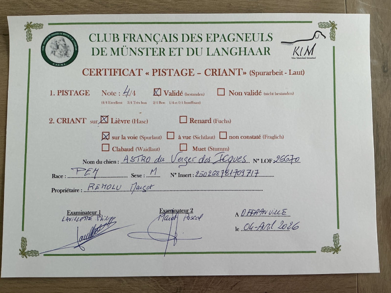 Ville: OFFRANVILLE - CERTIFICAT PISTAGE CRIANT - Juge : MR LAVILLETTE Philippe et MR MAROT Pascal